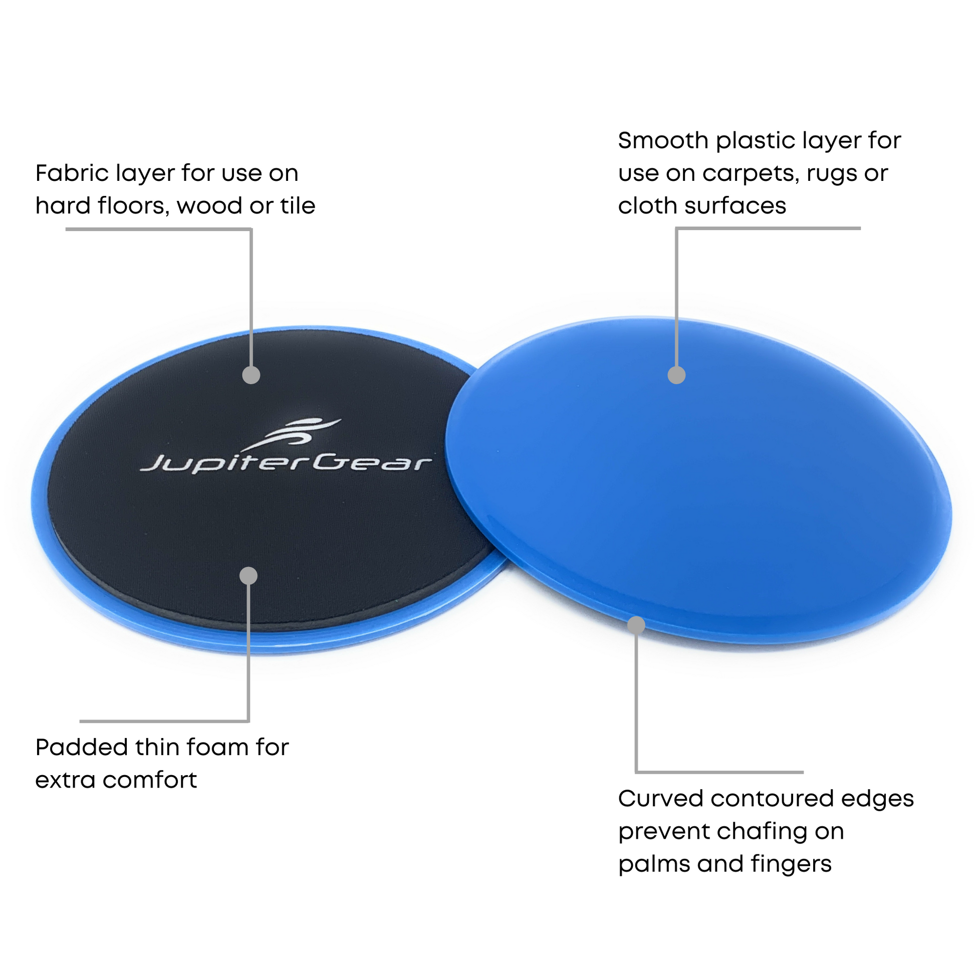 You’ll be able to bring your sliders everywhere you go and with the dual sides, you can slide on multiple surfaces! Nothing can stop you from getting your core workout in! The Foam side works best on hard, smooth surfaces like hardwood floors. The Plastic side works best on softer surfaces, like carpet or turf.